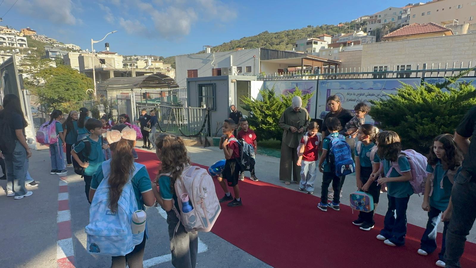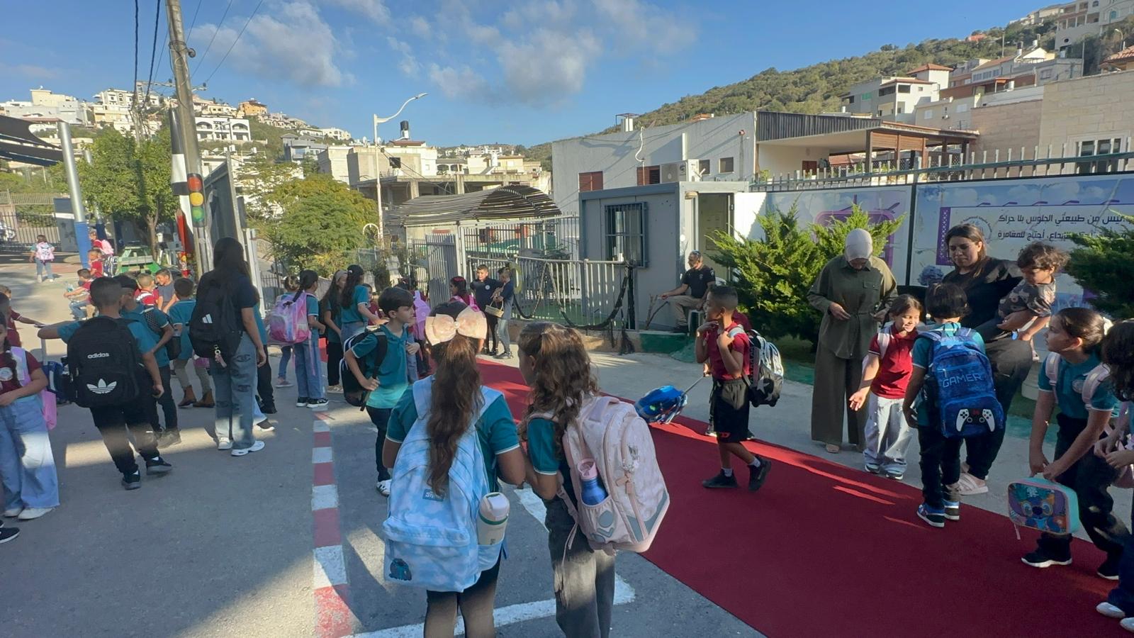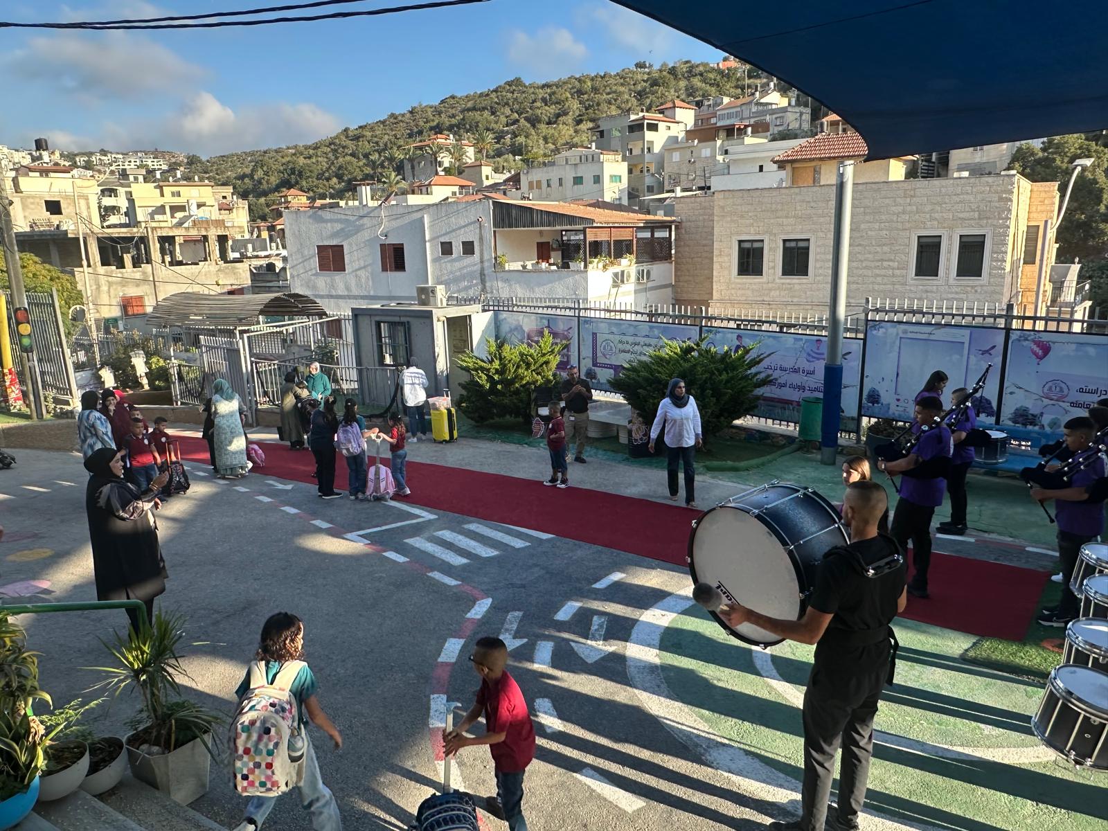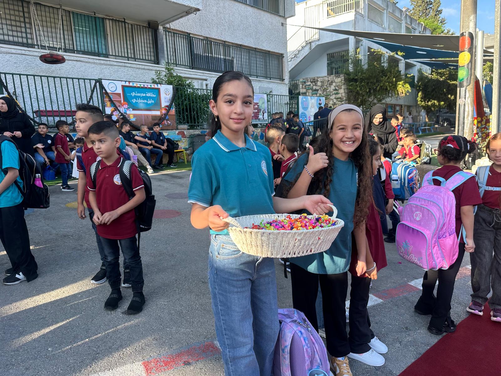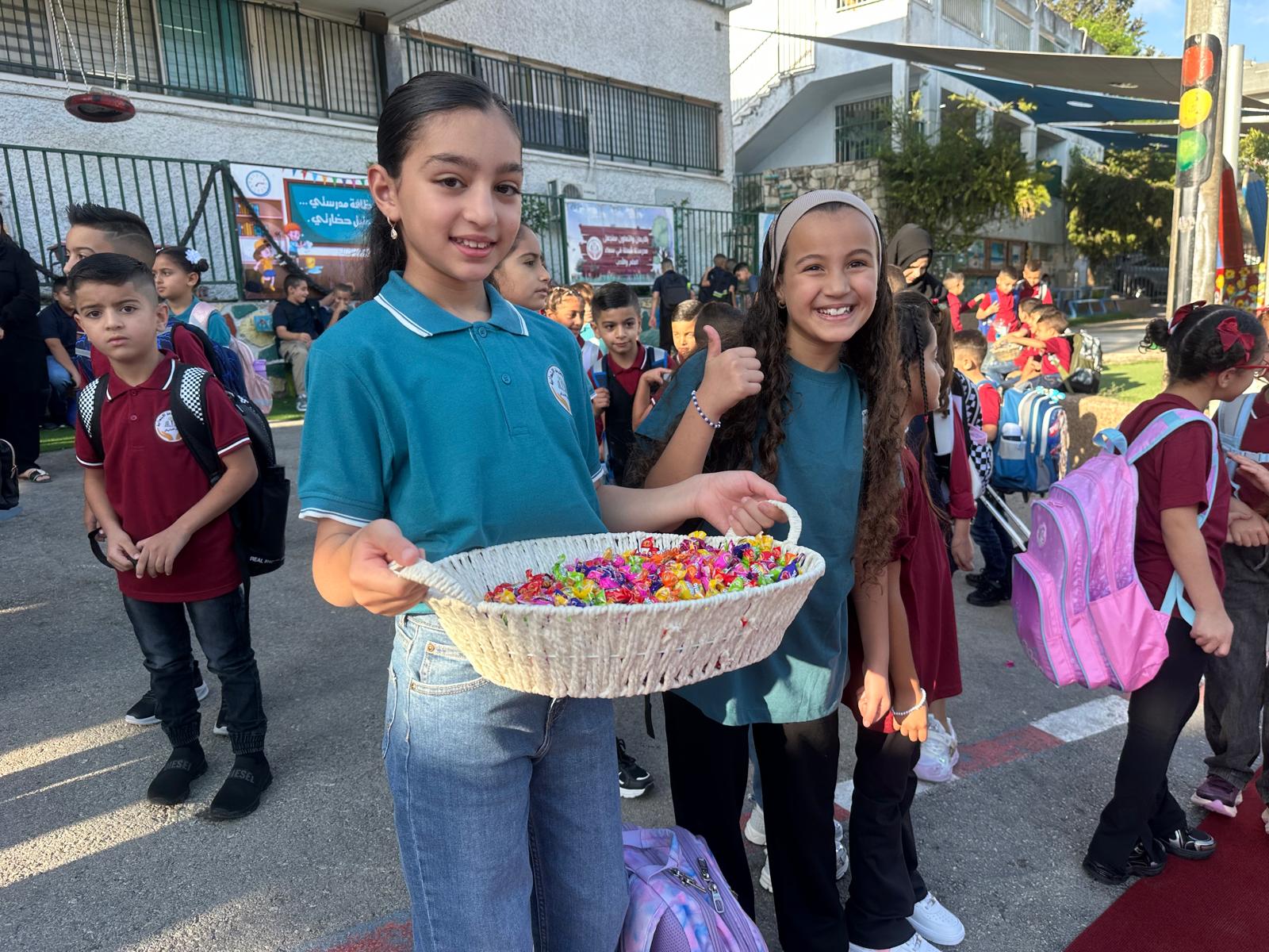 وقد استقبل المعلمون والمعلمات الطلاب على أنغام الكشافة المدرسة وتوزيع الحلويات ، حيث أعرب طلاب المدرسة عن سعادتهم الغامرة بالعودة الى المدرسة .تصوير موقع بانيت وقناة هلا