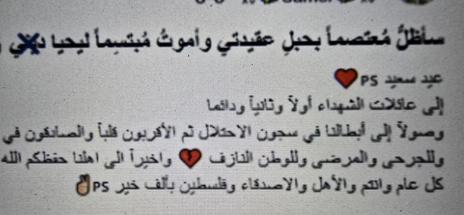 واضاف البيان: " خلال الأيام الأخيرة، تم توقيف مشتبهين من سكان شرقي القدس. في الحالة الأولى، تم توقيف أحد العاملين في مجال صيانة الفنادق في المدينة وضواحيها، في الثلاثينيات من عمره، وذلك بعد رصده من قبل مركز المراقبة والوعي. المشتبه قام بنشر مضامين عبر شبكات التواصل عبّر فيها عن دعمه وتأيده للمنظمات المعادية . ومن بين ما كتب: "سأبقى حصيناً ومتمسكاً بحبل إيماني وأموت مبتسماً كي تحيا ديني، عيد سعيد.. لعائلات الشهداء، لأبطالنا في سجون الاحتلال، ثم لأولئك الأقرب إلى قلوبنا وللأوفياء في مواقفهم معنا..." كل ذلك باستخدام مقاطع من خطاب إسماعيل هنية، الذي ورد فيه: "حماس تُكرس من أجل القدس والأقصى أرواحنا ودماءنا وعائلاتنا وأبناءنا. لا وجود لما يسمى بدولة إسرائيل وعاصمتها القدس، القدس ليست للبيع" " .