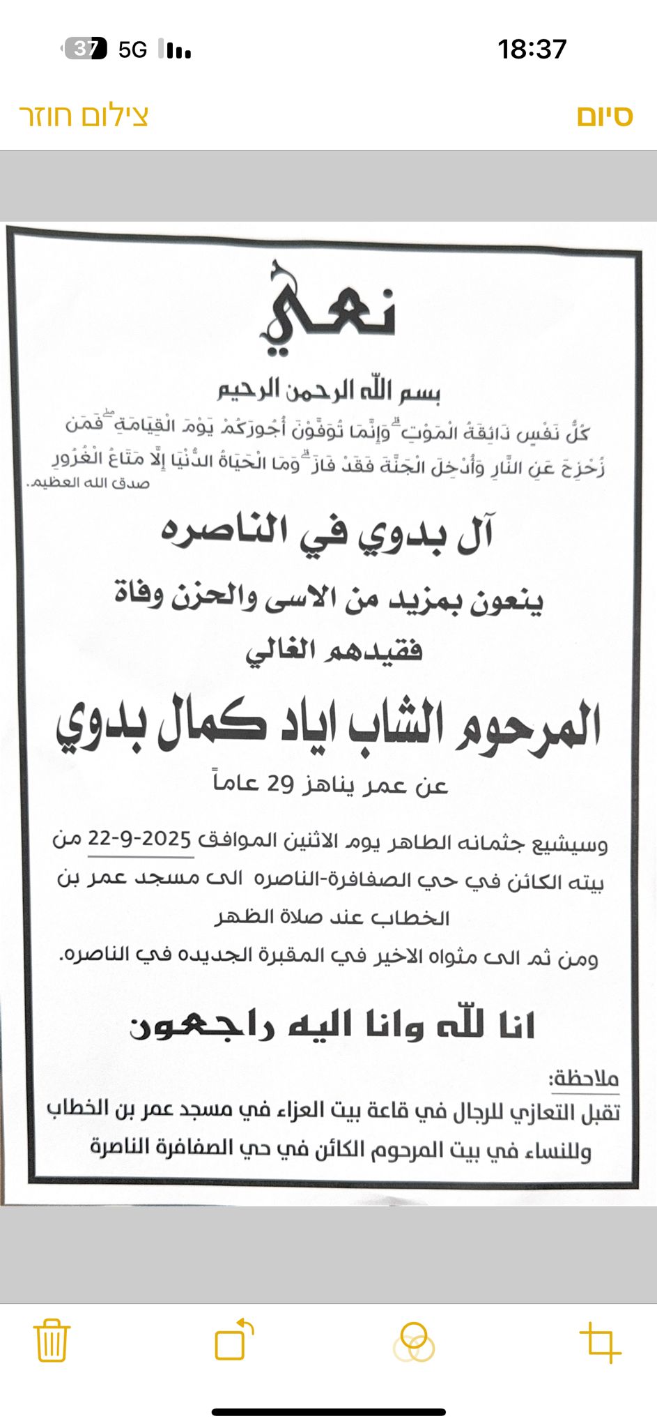 الناصرة تفجع بوفاة الشاب اياد كمال بدوي