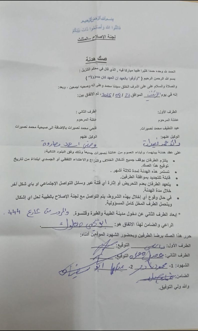 أعلنت لجنة الاصلاح في مدينة الطيبة، الليلة الماضية، عن التوصل لاتفاق هدنة بين عائلة المرحوم عبد اللطيف نصيرات وعائلة فتحي نصيرات، على خلفية مقتل الشاب معتصم نصيرات، قبل أقل من شهر.