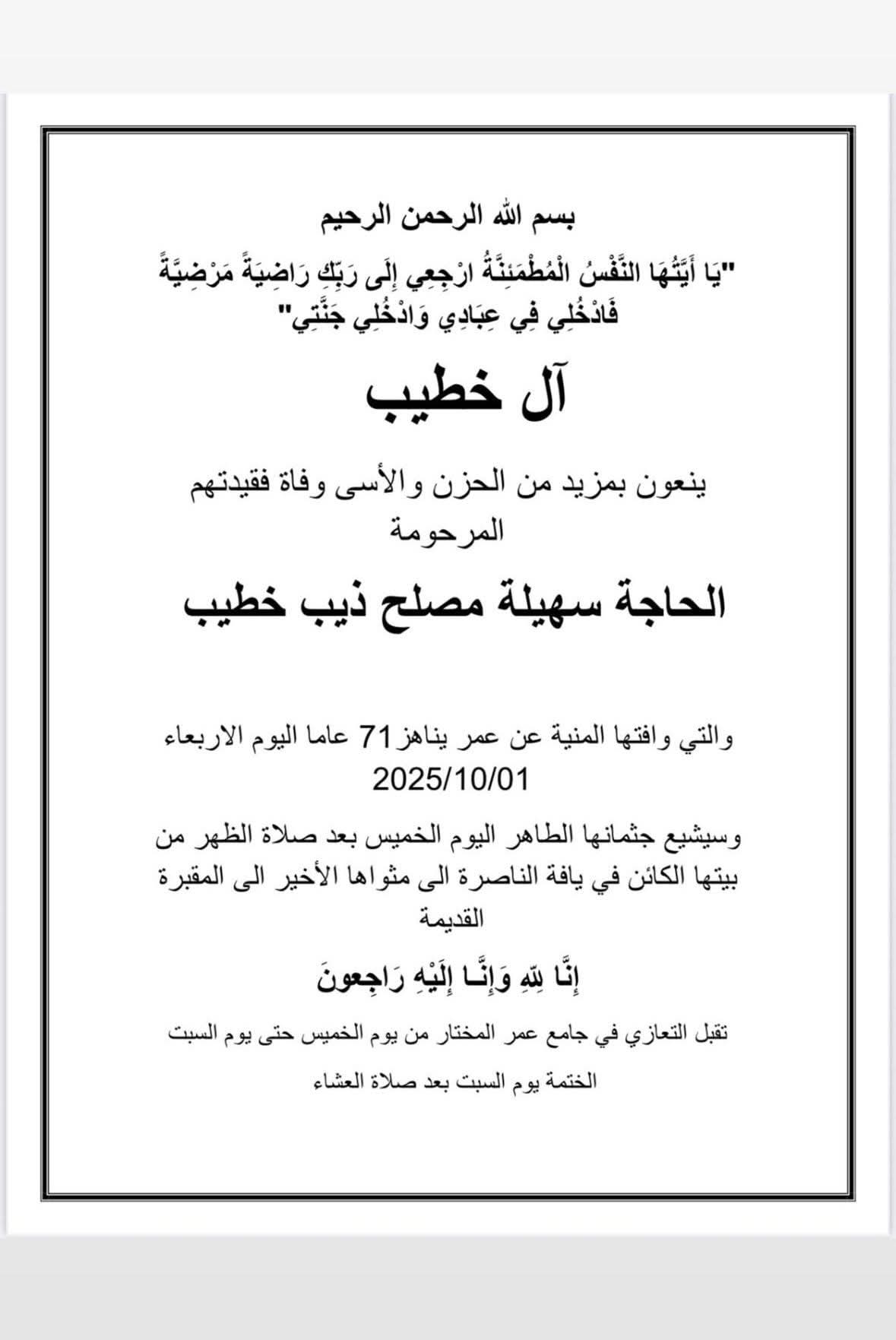 انتقلت الى رحمة الله تعالى الحاجة سهيلة مصلح ذيب خطيب عن عمر ناهز 71 عاما . وسيشيع جثمانها الطاهر غدا الخميس بعد صلاة الظهر من بيتها الكائن في يافة الناصرة الى مثواها الاخير في المقبرة القديمة .