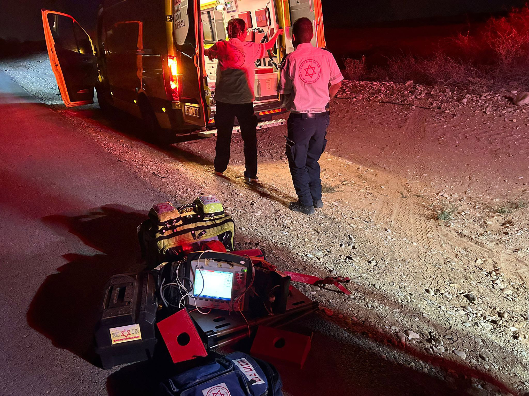 " تلقى مركز الطوارئ 101 التابع لنجمة داوود الحمراء في منطقة النقب بلاغا عن انقلاب تركتورون "باغي" في منطقة مفتوحة في وادي حيبوشيت قرب كيبوتس تسئاليم. وقدم الطاقم الطبي التابع لنجمة داوود الحمراء في المكان علاجا طبيا لرجل يبلغ نحو 50 عاما، وُصف وضعه بالحرج وهو يخضع لعمليات إنعاش " .