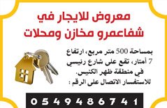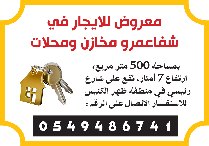 معروض للايجار في شفاعمرو: مخازن ومحلات، بمساحة 500 متر مربع، ارتفاع 7 أمتار، تقع على شارع رئيسي في منطقة "ظهر الكنيس". للاستفسار الاتصال على الرقم : 0549486741