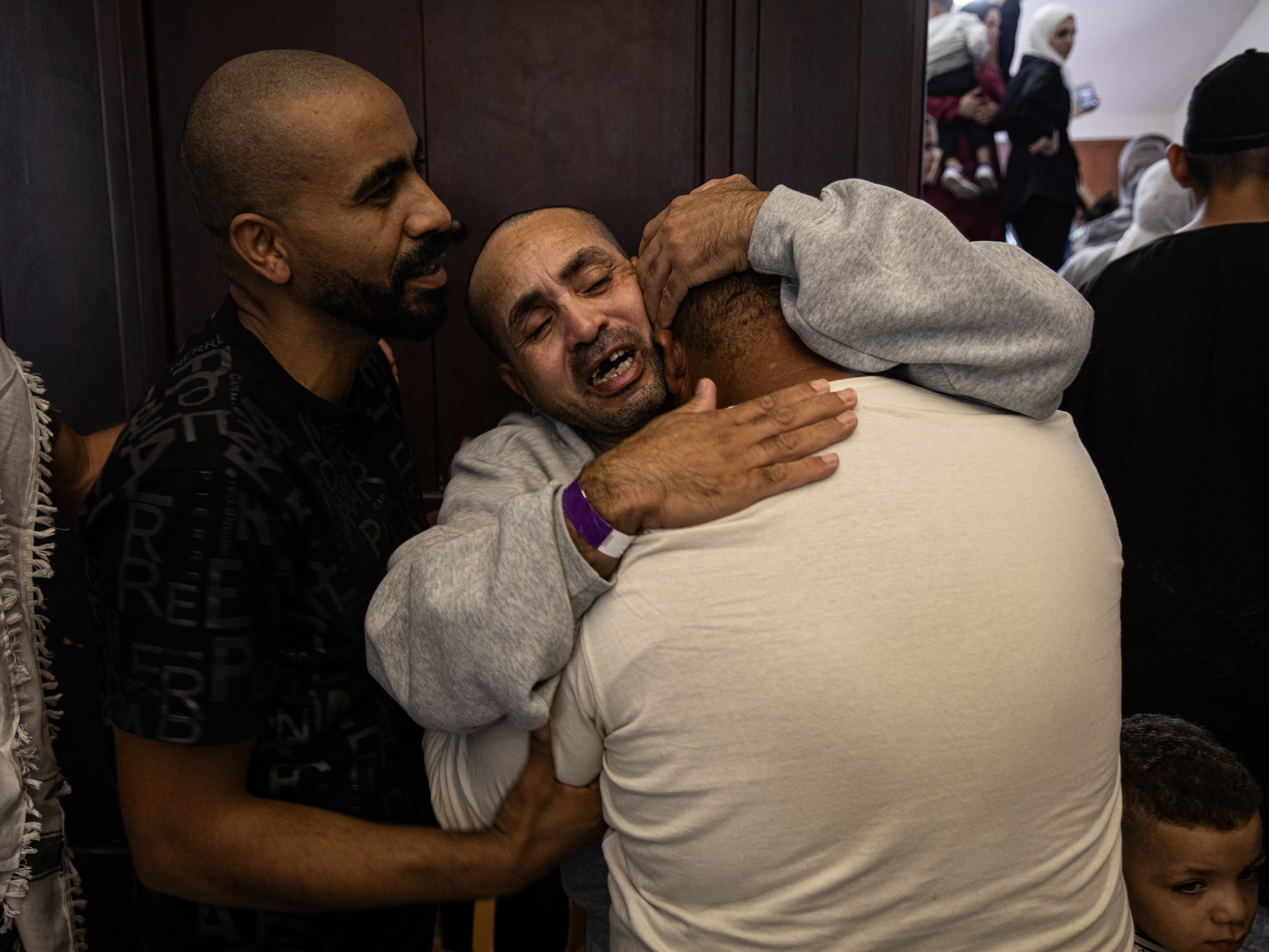 وتجمع الآلاف داخل وحول مستشفى ناصر في خان يونس جنوب قطاع غزة، في انتظار وصول السجناء المحررين ولوح بعضهم بالعلم الفلسطيني ورفع آخرون صور ذويهم. وقالت أم أحمد وهي تغالب دموعها إنه رغم فرحتها بإطلاق سراحهم إلا أنها لا تزال تحس بمشاعر مختلطة تجاه هذا اليوم