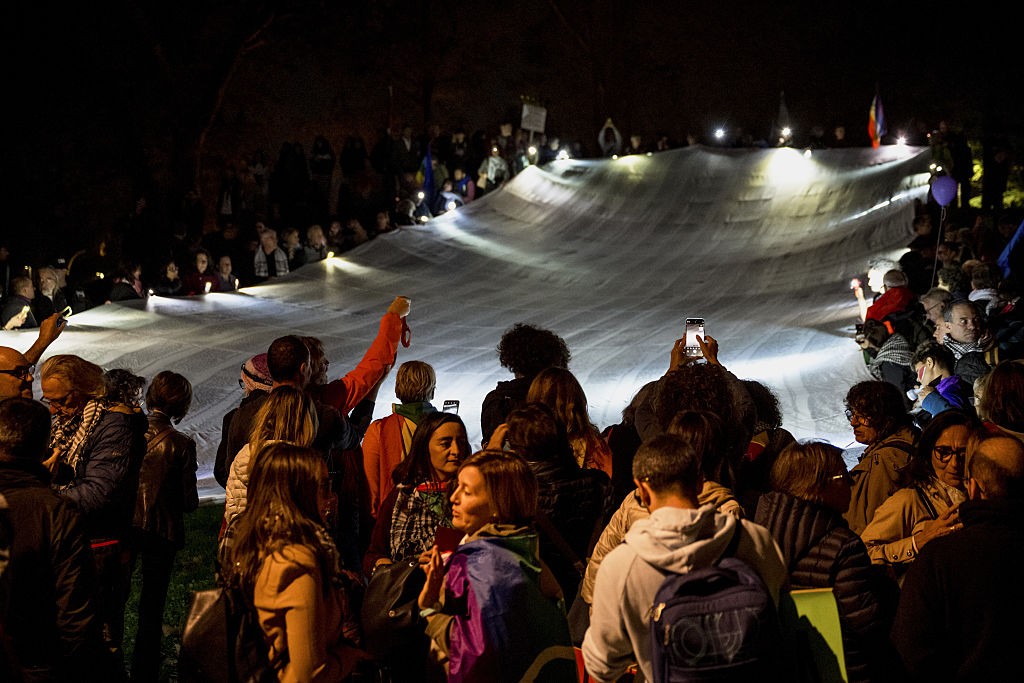 وحمل المتظاهرون علما فلسطينيا طوله 18 مترا ولافتة حمراء كبيرة كُتب عليها شعار المظاهرة "استخدم البطاقة الحمراء في وجه إسرائيل". وكان هناك تمثال معدني يرمز إلى العدالة يحمل ميزانا في يد وبطاقة حمراء في الأخرى.تصوير: Photo by Valeria Ferraro/Anadolu via Getty Images