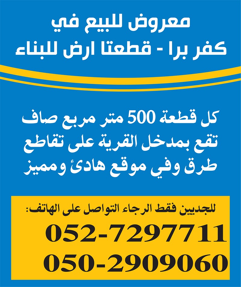 معروض للبيع في كفر برا - قطعتا ارض للبناء،كل قطعة 500 متر مربع صاف تقع بمدخل القرية على تقاطع طرق وفي موقع هادئ ومميز.