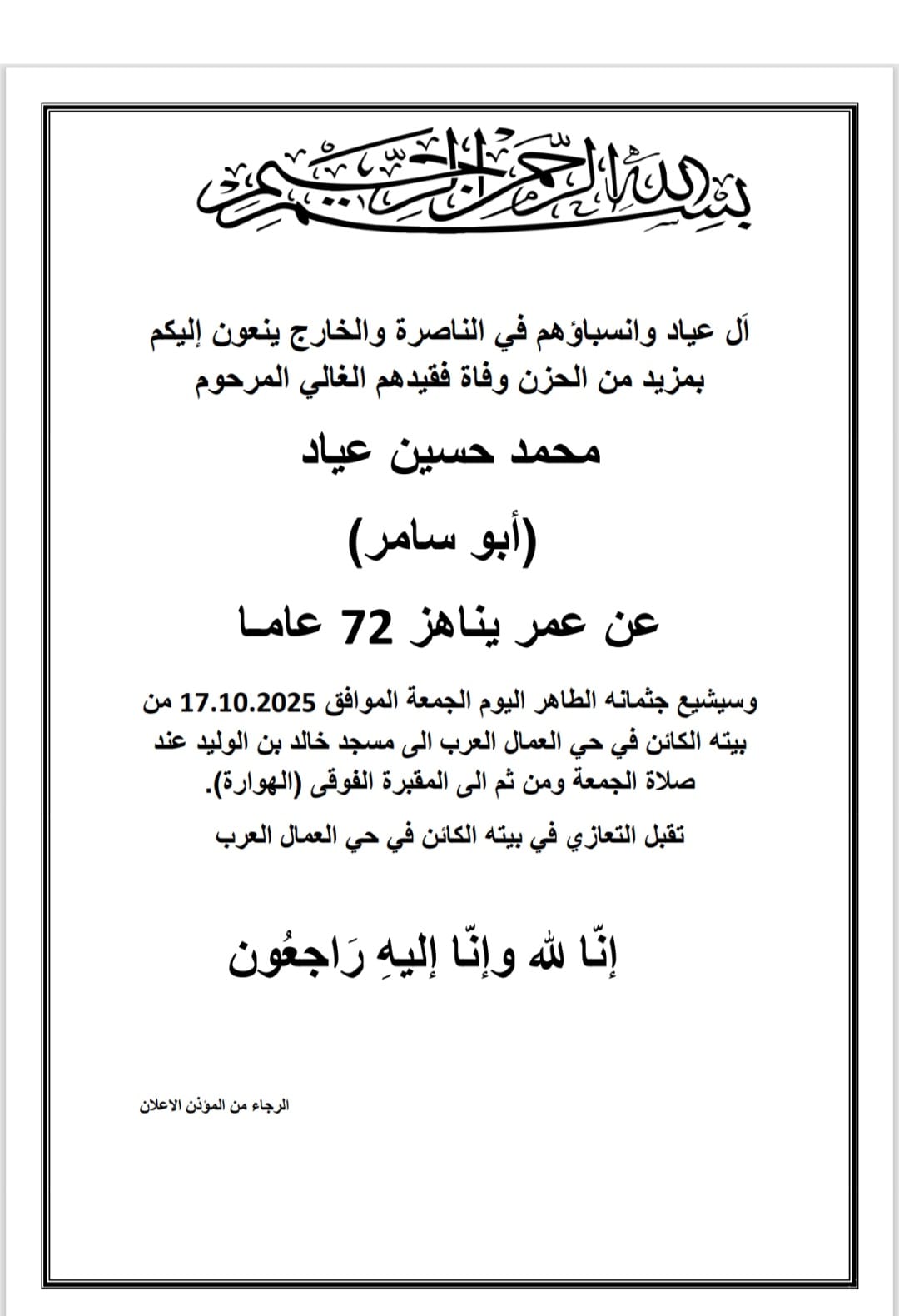 انتقل الى رحمة الله تعالى، محمد حسين عياد "أبو سامر" من الناصرة عن عمر يناهز 72 عاما. سيتم تشييع جثمان الفقيد اليوم الجمعة من بيته الكائن في حي العمال العرب الى مسجد خالد بن الوليد عند صلاة الجمعة،