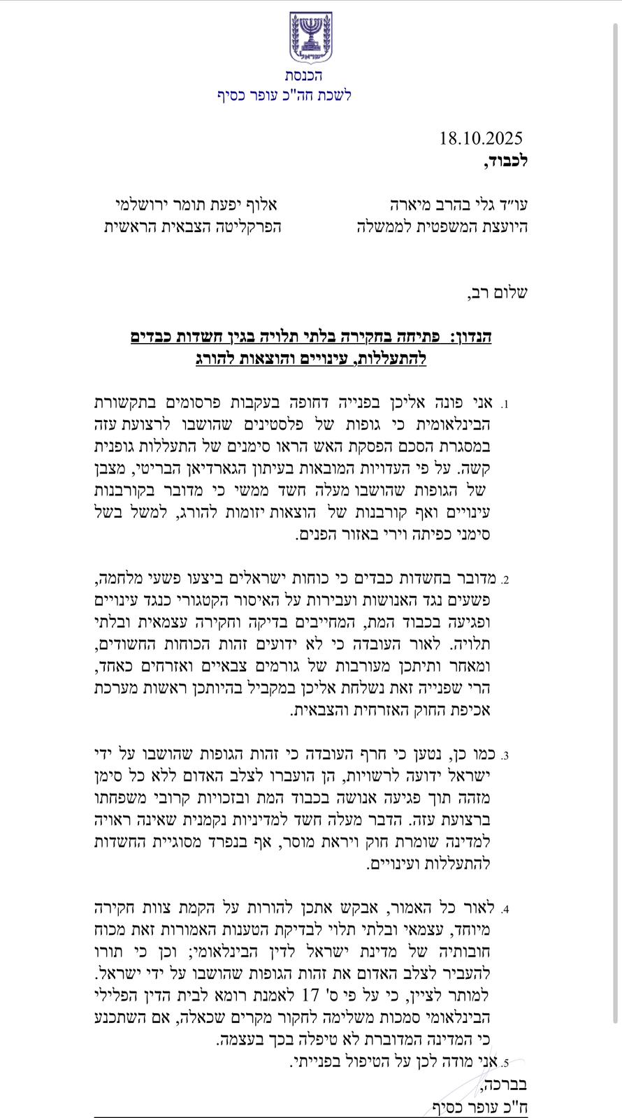 وجاء في رسالة النائب كسيف أنّ " الحديث يدور حول شبهات خطيرة بأنّ قوات الجيش ارتكبت جرائم حرب، وجرائم ضد الإنسانية، وانتهاكات لقانون حظر التعذيب والمسّ بكرامة الموتى – وهي جرائم تفرض إجراء فحص وتحقيق مستقلين. وبما أنّ هوية القوات المشتبه بها غير معروفة، ولأنّ من المحتمل وجود ضلوع لعناصر عسكرية ومدنية معًا، فقد أُرسلت الرسالة إلى سلطتي إنفاذ القانون المدنية والعسكرية " .