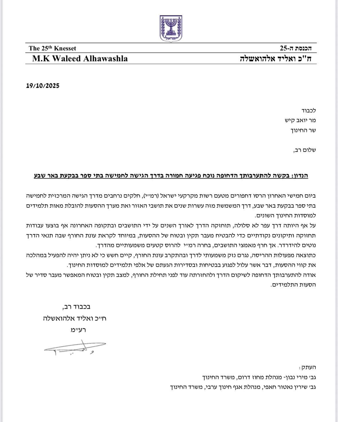 النائب وليد الهواشلة يطالب وزير التعليم بتدخّل عاجل لإصلاح طريق المدارس في نقع بئر السبع